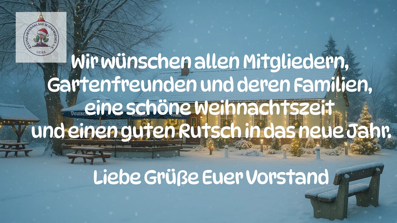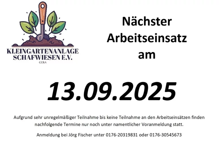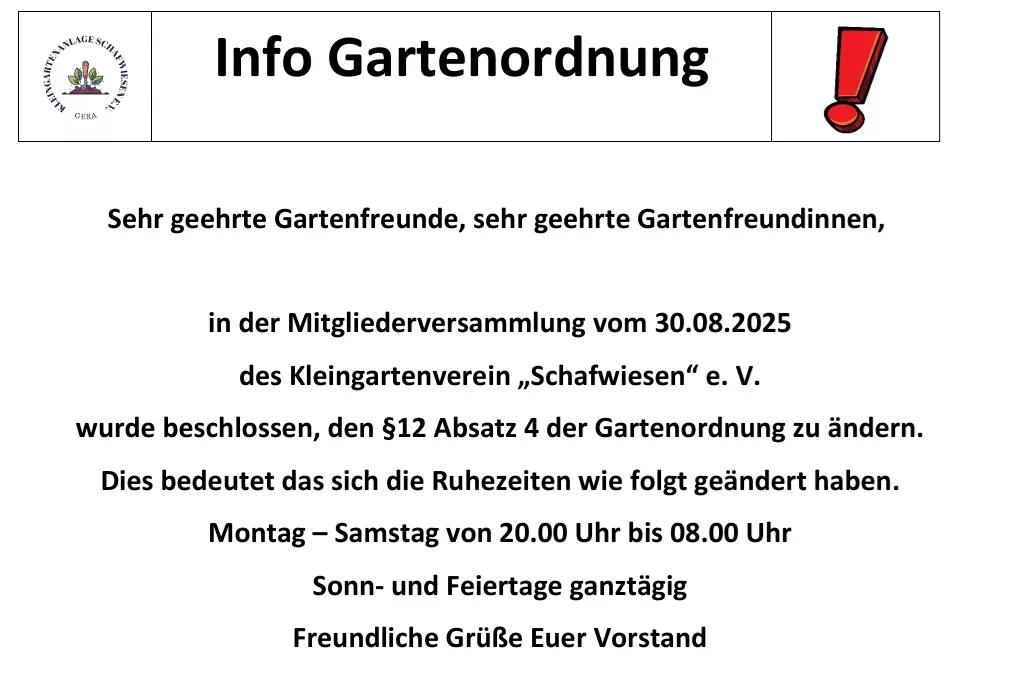 in der Mitgliederversammlung vom 30.08.2025 des Kleingartenverein „Schafwiesen“ e. V. wurde die Satzung neu beschlossen, weiterhin wurden Punkte in der Gartenordnung geändert. Alle Dokumente werden demnächst auf der Homepage zum Nachlesen zur Verfügung stehen.